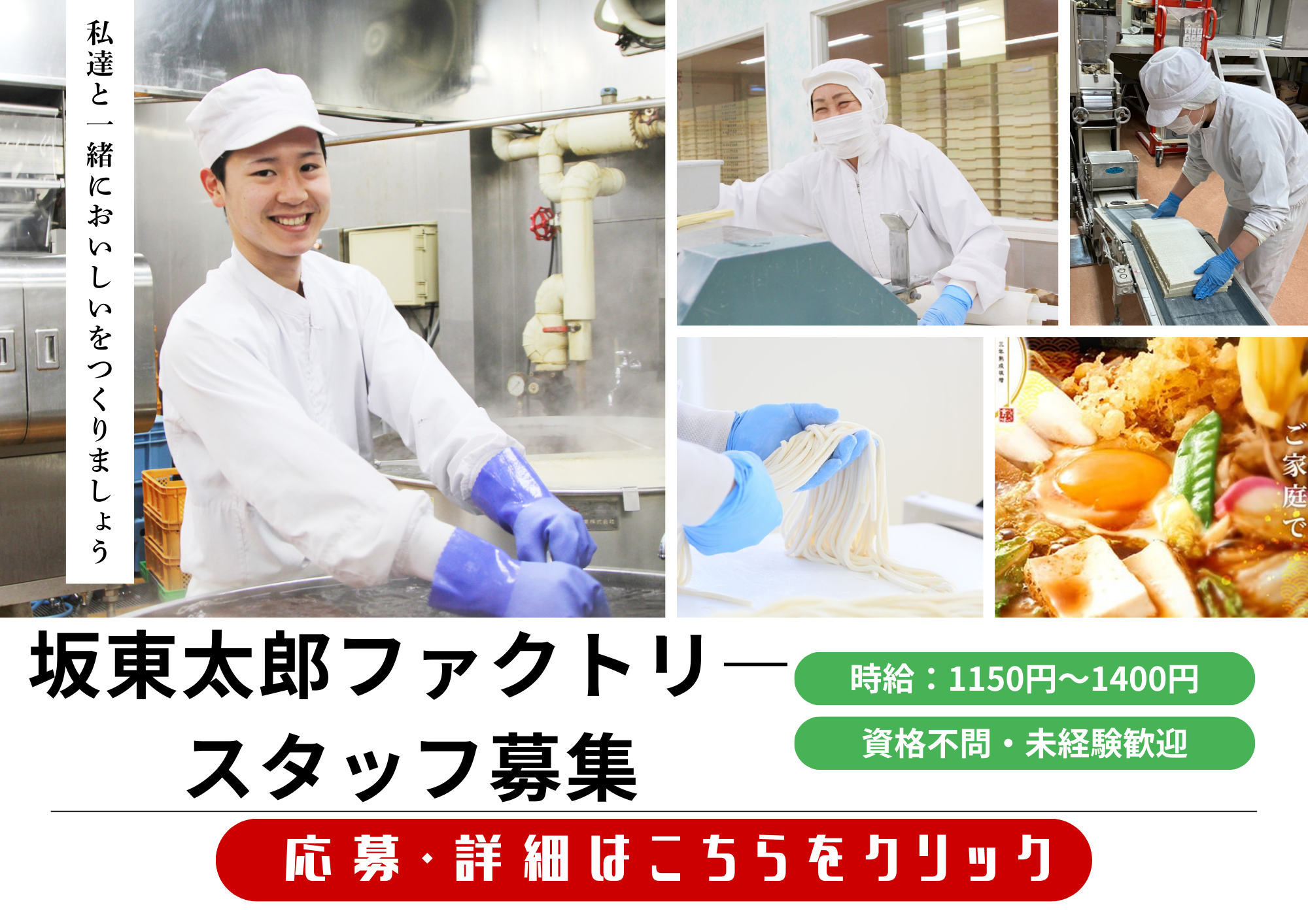 この度年末年始の出荷量の増量に伴いまして、坂東太郎グループ自社工場の坂東太郎ファクトリーにて新規スタッフを大募集させて頂きます! 未経験の方、主婦の方、経験者の方、大歓迎です!!