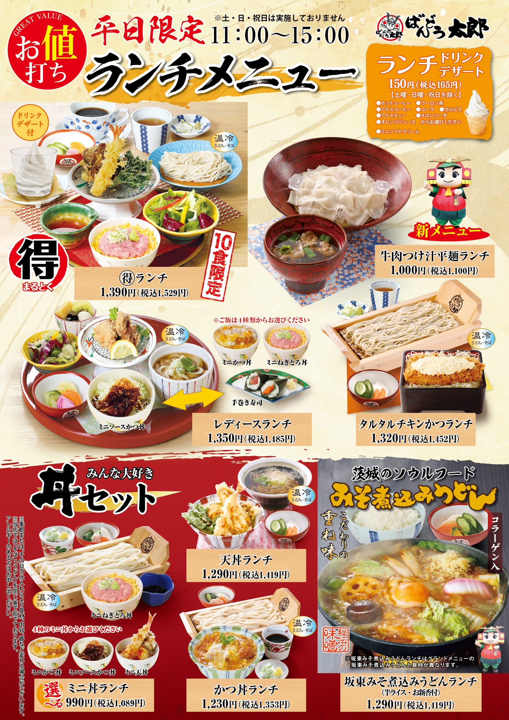 ランチメニュー 11時~15時㊊~㊎※土曜日、日曜日、祝日は実地しておりません。また、坂東太郎土浦おおつ野店はランチメニューは取り扱いありません。